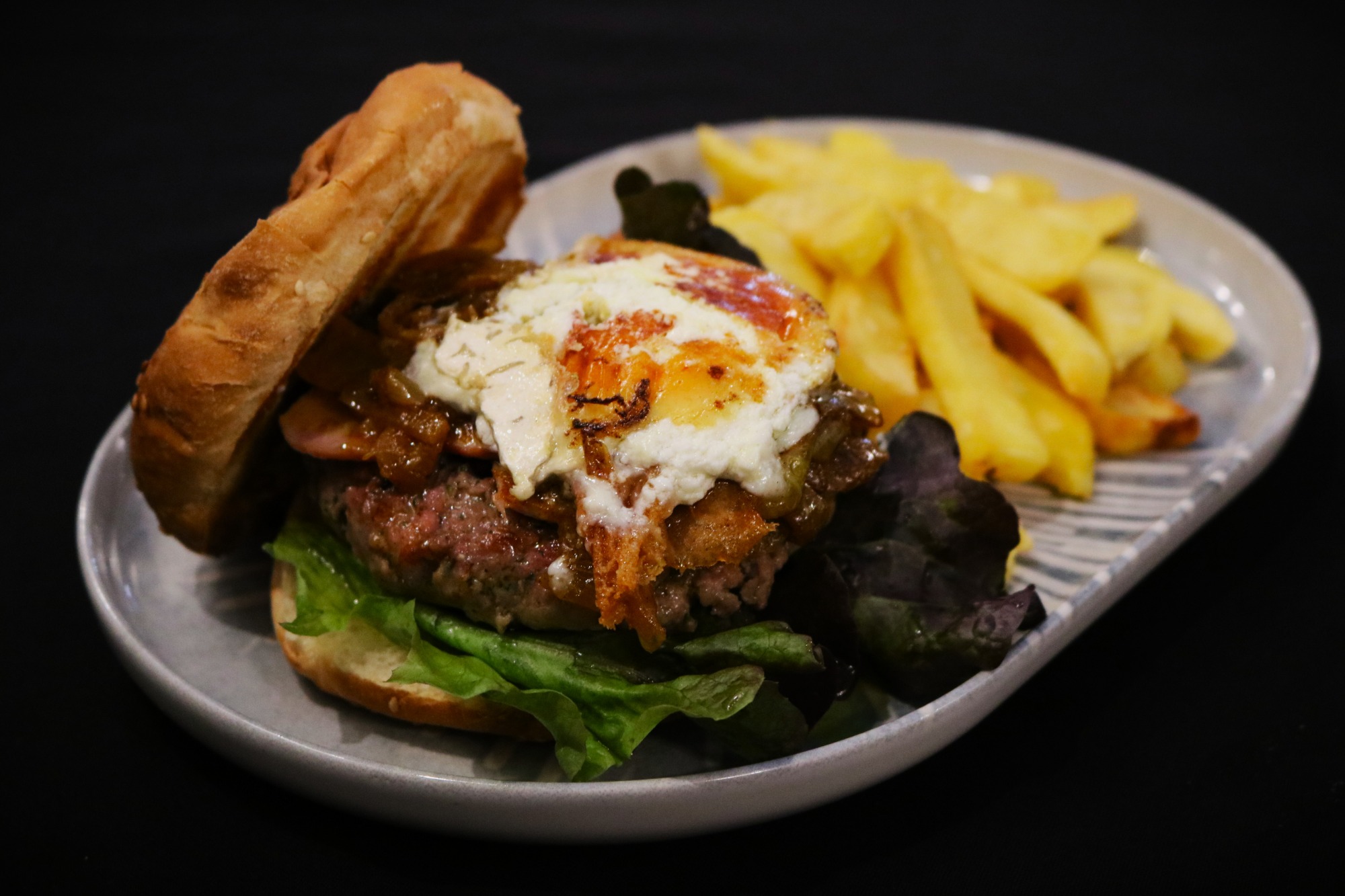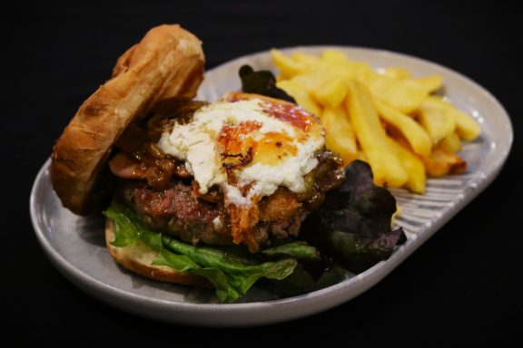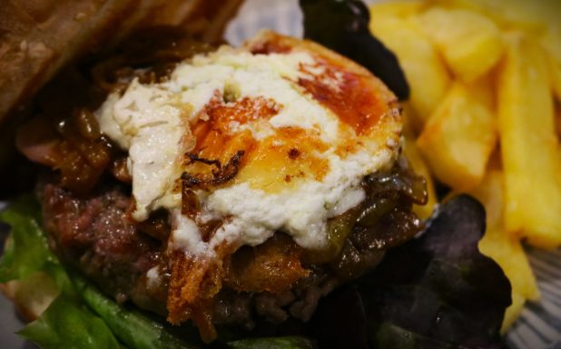 Hamburguesa de ternera con queso de cabra y cebolla caramelizada / Beef burguer